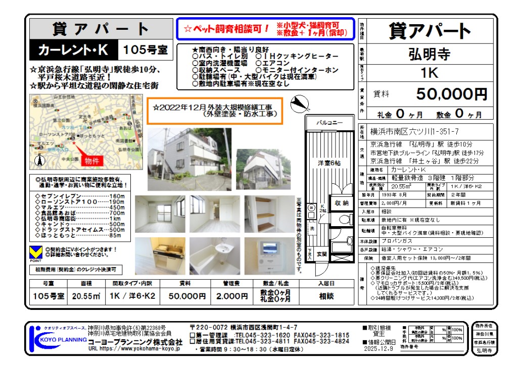 本格的な大規模リニューアル工事を実施中。オートロック・エレベータ新設。外壁、共用部の大規模修繕(9月末完成予定)。CATVの1Gbpsネット付。ペット可(小型犬・猫、敷金1ヶ月増、敷金1ヶ月償却)。