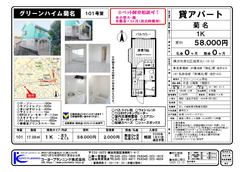| 5,000円 | 0ヶ月 | 駅まで徒歩 10分 | 1 K | |||